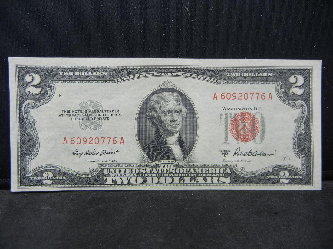 2 dollar bill with red ink 1953. How Much Is 1953 Red Seal 2 Dollar Bill Worth? (Know The Value) How much is a 1953 red seal $2 bill worth? Any 1953 red print $2 should sell for about $2.50. About $8 per note for 100 consecutive red writing two dollar bills. The same goes to smaller runs of consecutive notes. If you have 1953 $2 star notes in decent condition, then expect to get about $5 for it while $15 for uncirculated. 1953 TWO DOLLAR BILL STAR NOTE with RED SERIAL NUMBER - YouTube 1953 TWO DOLLAR BILL STAR NOTE with RED SERIAL NUMBERFilmed in 1080p HDFilmed by HiddenTreasureHunterPlease donate $ if you are able: ... 1953C $2 Red Seal Value - How much is 1953C $2 Bill Worth? Sell 1953c $2 Bill. 1. Granahan - Dillon. 1. Type Note. 1 Variety with a Star Serial Number. Please submit a good photo or scan. It will be identified and evaluated. Understand there may be subtle differences between the image you see above and your note. Red Seal Two Dollar Bills- 1953 Series A - YouTube Circulated stars sell for about $3, uncirculated star sell for closer to $15. 1957, 1957A, and 1957B $1 silver certificate star notes are common and only worth about $2.50 in circulated condition....