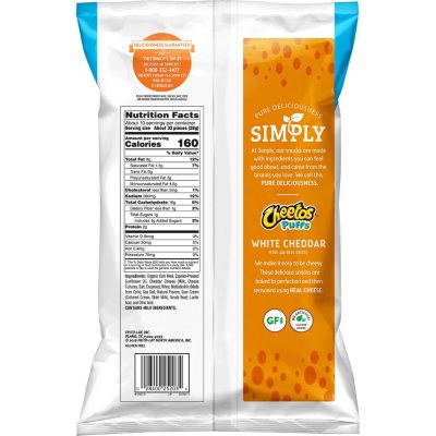 CHEETOS ® Simply Puffs White Cheddar Cheese Flavored Snacks CHEETOS ® Simply Puffs White Cheddar Cheese Flavored Snacks are made with no artificial flavors, preservatives, or colors. Nutrition Facts Ingredients Buy Now Buy Now CHEETOS® Simply Puffs White Cheddar Cheese Flavored Snacks (opens a popup) Product Reviews ★★★★★ ★★★★★ 2.3 19 Reviews 6 out of 18 (33%) reviewers recommend this product