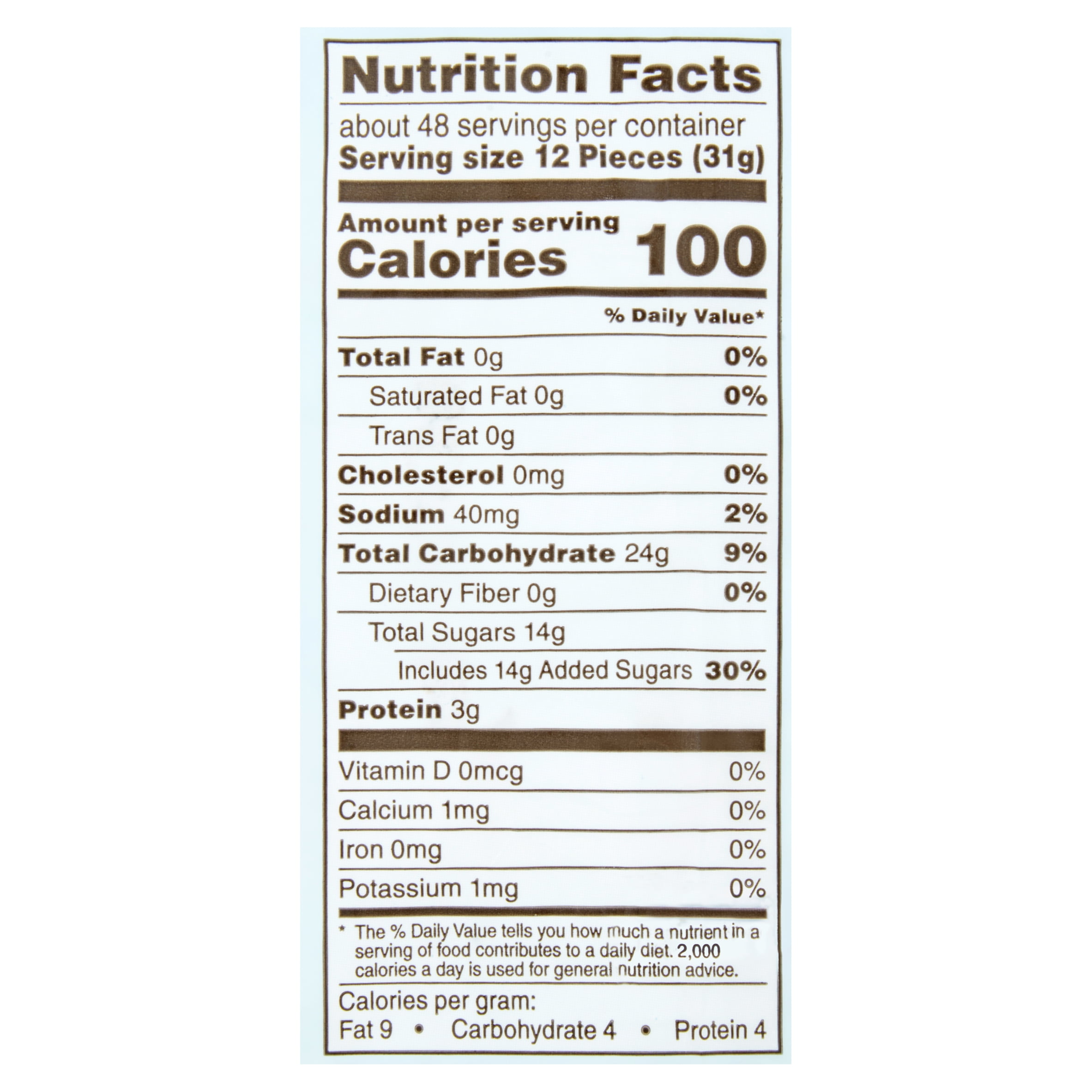 Sugar-Free, Gummy Bears Nutrition Facts - Eat This Much How much Calcium is in Sugar-Free, Gummy Bears? Amount of Calcium in Sugar-Free, Gummy Bears: Calcium 0mg. 0%. Fatty acids. Amino acids. * The Percent Daily Values are based on a 2,000 calorie diet, so your values may change depending on your calorie needs. Find on Amazon. › gummy-bears-recipe-520896Do-It-Yourself Gummy Bears Recipe - The Spruce Eats Jun 30, 2022 · These gummy bears lack preservatives and are naturally just a little sticky to the touch. Heat and humidity can cause them to become even stickier, and even melt. Depending on the climate, it's best to store these candies in the refrigerator, and always in an airtight container. Nice! Gummy Bears Macro Nutrition Facts [Food Label Data] Nutritional information for Nice! Gummy Bears. Per 15 bears (39g): 130 Calories | 0g Fat | 31g Carbohydrates | 0g Fiber | 18g Sugar | 3g Protein | 15mg Sodium | 0mg Cholesterol | 0mg Potassium.