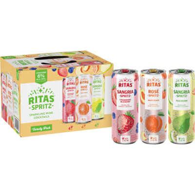 RITAS SPRITZ VARIETY PACK - double eagle dist Skip the stress with our fruity Variety Pack. Have all the fizz, all of the fun, and none of the wine with RITAS Strawberry Blueberry Sangria Spritz, RITAS White Peach Rose' Spritz, and Ritas Pear Orange Sangria Spritz. Origin USA. Style Sparkling Sangria Cocktail. Alcohol by Volume 6%. Calories 201. Carbohydrates 21.2.