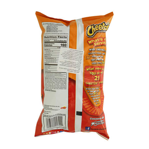 Cheetos Crunchy Allergy and Ingredient Information Cheetos Crunchy Cheetos Crunchy Cheese 2.25 Ounce BagCheetos Crunchy Cheese 2.25 Ounce Bag, UPC Code 028400345279 Manufactured by Frito-Lay. ... Nutrition Label. Nutrition Facts. Serving Size 28.00 g. Servings Per Container 2.00. Amount Per Serving. Calories 150 % Daily Value* Total Fat 10g. 15.38%. Saturated Fat 1.5g. Home | Cheetos CHEETOS® snacks are the much-loved cheesy treats that are fun for everyone! You just can't eat a CHEETOS® snack without licking the signature "cheetle" off your fingertips. And wherever the CHEETOS® brand and CHESTER CHEETAH® go, cheesy smiles are sure to follow. CHEETOS® Crunchy Cheese Flavored Snacks 10 Multi- ... Write a review. Description. Box w/10 packages of 1OZ each. Nutrition Facts ... Ingredients. Enriched Corn Meal (Corn Meal, Ferrous Sulfate, Niacin, ...