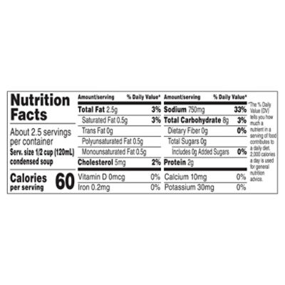 Campbell's cream of chicken soup nutrition label. Campbell's ® Condensed Cream of Chicken It's easy to prepare and delicious all on its own in a bowl but it's also a wonderfully cost effective way to add flavour when used as an ingredient in a variety of simple and satisfying recipes you can find at CookWithCampbells.ca. Nutritional Information. Per 1/2 cup condensed (125 mL) Serving. Amount. % Daily Value. Campbell's Condensed Cream of Chicken Soup, Family Size 22.6 oz. Can ... Nutrition facts. Refer to the product label for full dietary information, which may be available as an alternative product image. 5.0 Servings Per Container. ... or easy chicken pot pie. With high-quality ingredients, Campbell's Cream of Chicken Soup is food you can feel good about - let's start something good. M'm! M'm! Nutrition Facts for Campbell's Cream of Chicken Soup Protein 2g. 0% Vitamin D 0mcg. 1% Calcium 10mg. 1% Iron 0.2mg. 1% Potassium 40mg. 17% Vitamin A 150mcg. 0% Vitamin C 0mg. *. The % Daily Value (DV) tells you how much a nutrient in a serving of food contributes to a daily diet. 2,000 calories a day is used for general nutrition advice. Campbell's Healthy Request Cream of Chicken Soup Macro Nutrition Facts ... Keto & Health Insights for Campbell's Healthy Request Cream Of Chicken Soup. Net Carbs are 13% of calories per serving, at 9g per serving.This meal falls within the range for standard keto diet guidelines (at or under 25g of net carbs). If your daily net carb quota is 25g and if this food almost equals that much, consider whether you're going to eat more food later.
