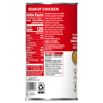 98% Fat Free Cream of Chicken Soup - Campbell Soup Company Campbell's® Condensed 98% Fat Free Cream of Chicken Soup is a flavorful combination of creamy chicken stock and tender chicken meat blended with quality cream. Our 98% Fat Free soup is proven to be something the whole family will love. Savor a steamy bowl on its own or amp it up as a versatile recipe ingredient. Where to Buy. › p › campbell-39-s-condensed-familyCampbell's Condensed Family Size Cream of Mushroom Soup - Target Read reviews and buy Campbell's Condensed Family Size Cream of Mushroom Soup - 22.6oz at Target. Choose from Same Day Delivery, Drive Up or Order Pickup. Free standard shipping with $35 orders. Campbell's Condensed Cream of Chicken Soup, 10.5 Ounce Can - Walmart.com Nutrition facts. Refer to the product label for full dietary information, which may be available as an alternative product image. 2.5 Servings Per Container. ... or easy chicken pot pie. With high-quality ingredients, Campbell's Cream of Chicken Soup is food you can feel good about - let's start something good. M'm! M'm! Campbell's® Classic Ready to Serve Cream of Chicken Soup - Campbells ... Campbell's® Classic Ready to Serve Cream of Chicken Soup. Nutrition Facts: 1 Serving Per Container: Serving size: ... this information may not always be identical to the Nutrition Facts table found on the labels of products. Case Code. 00443. Pack & Size. 24 / 7.25 OZ. ... Campbell's® Ready to Serve Cream of Chicken Soup is a great offering ...