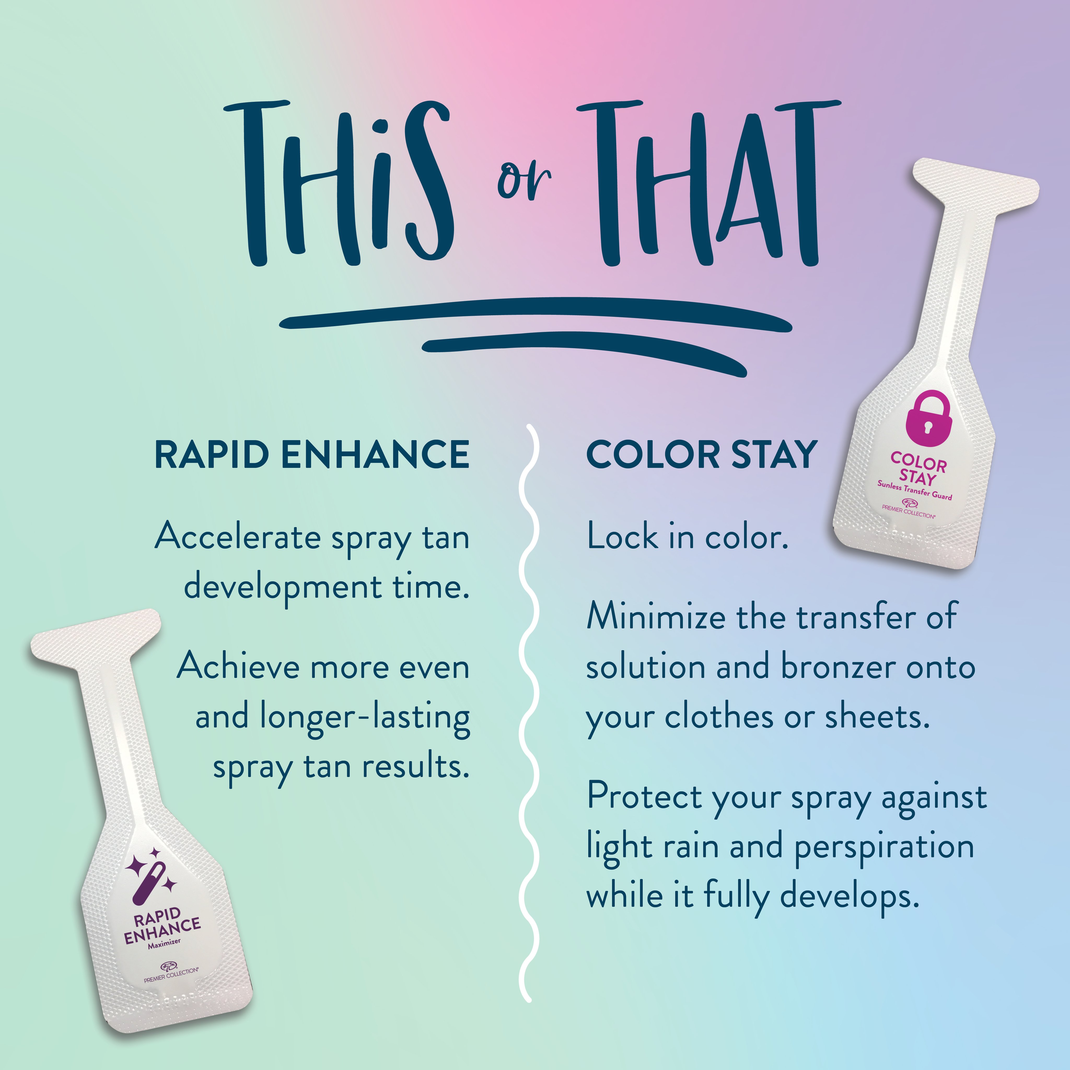 Exclusive Premier Sunless Spray Tanning Solutions and Products Premier Collection ® Sunless Solutions. ... Lock in color and minimize the transfer of solution and bronzer onto your clothes or sheets. Plus, protect your spray against light rain and perspiration while it fully develops. Versa Spa Ultimate in Comfort. 3-4 minutes; 4 positions;