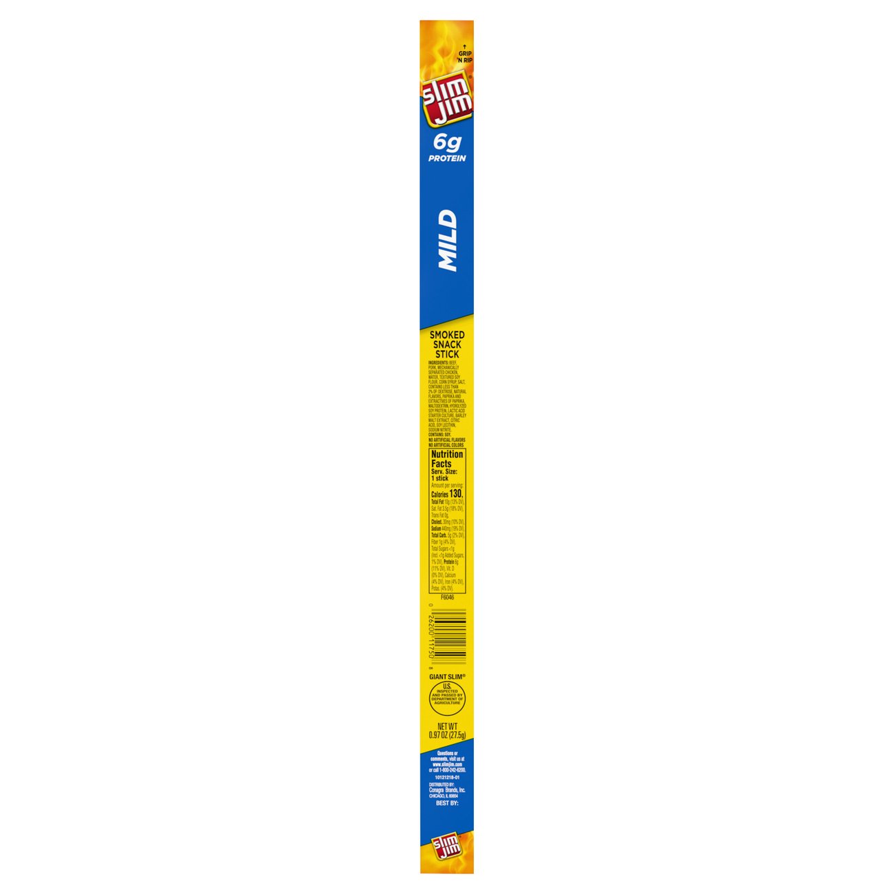 Meat and Cheese Sticks | Slim Jim These meat and cheese sticks are the power couple of snacks. Explore the different meat and cheese stick options from Slim Jim. Slim Jim Giant Slim Mild Allergy and Ingredient Information Slim Jim Giant Slim Mild Twenty Four 0.97 Ounce Giant Slim Jim Mild Meat Snacks, UPC Code 026200117553 Manufactured by ConAgra Foods Inc. ... THIS INGREDIENTS LABEL CONTAINS: 1 TOP 14 allergen. Slim Jim Giant Slim Mild. Made By: Slim Jim. SKU/UPC CODE: # 026200117553. PRODUCT DESCRIPTION: ...