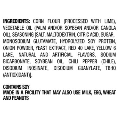 Takis Nutrition Facts, Ingredients, Are Takis Bad For You? Ingredients in Takis Corn Flour (Processed With Lime). Vegetable Oil (Palm And/or Soybean And/or Canola Oil). Seasoning [Salt, Maltodextrin. Sugar. Citric Acid. Monosodium Glutamate. Onion Powder. Hydrolyzed Soy Protein. Yeast Extract. Yellow 6 Lake. Red 40 Lake. Natural And Artificial Flavors. Soybean Oil. Sodium Bicarbonate. Chili Pepper (Chile).