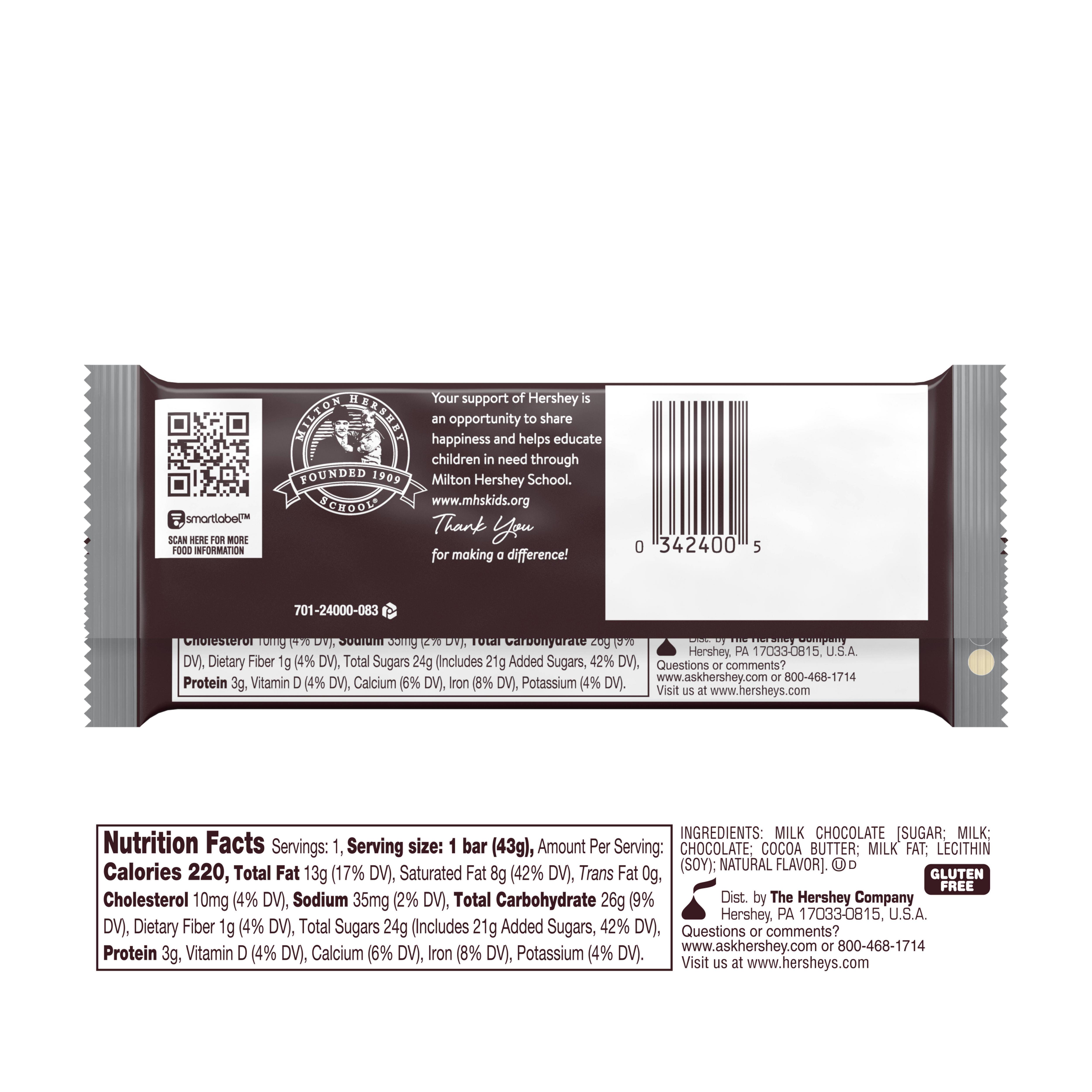 › foods › 1481Nutrition Facts for Hershey's Milk Chocolate Bar - MyFoodDiary Nutrition Facts for Hershey's Milk Chocolate Bar • MyFoodDiary® Milk Chocolate Bar Nutrition Facts Serving Size bar 1 bar = 43g Amount Per Serving 220 Calories % Daily Value* 20% Total Fat 13g 40% Saturated Fat 8g Trans Fat 0g 3% Cholesterol 10mg 2% Sodium 35mg 9% Total Carbohydrate 26g 4% Dietary Fiber 1g Total Sugars 25g 42% HERSHEY'S Milk Chocolate Snack Size Candy Bars Dietary Fiber 1g 2%. Total Sugars 14g. Includes 12g Added Sugar 25%. Protein 2g. Vitamin D 0.0mcg 0%. Calcium 51.5mg 4%. Iron 1.1mg 6%. Potassium 95.9mg 2%. * The % Daily Value (DV) tells you how much a nutrient in a serving of food contributes to a daily diet. 2,000 calories a day is used for general nutrition advice. HERSHEY'S Milk Chocolate Candy Bar, 1.55 oz This HERSHEY'S Chocolate Bar makes life delicious. There's happy, and then there's HERSHEY'S Happy. This HERSHEY'S Chocolate Bar makes life delicious. ... Nutrition Label. Nutrition Facts. ... Additional Label Information OU-D. The Union of Orthodox Jewish Congregations of America (the Orthodox Union) is the sole and exclusive owner ... Calories in Hershey's Milk Chocolate Candy Bar | CalorieKing Calorie Breakdown. Where do the calories in Hershey's Milk Chocolate Candy Bar come from? 44.6% 50.2% 5.2% Total Carbohydrate Total Fat Protein 220 cal. The % Daily Value (DV) tells you how much a nutrient in a serving of food contributes to a daily diet. 2,000 calories a day is used for general nutrition advice.