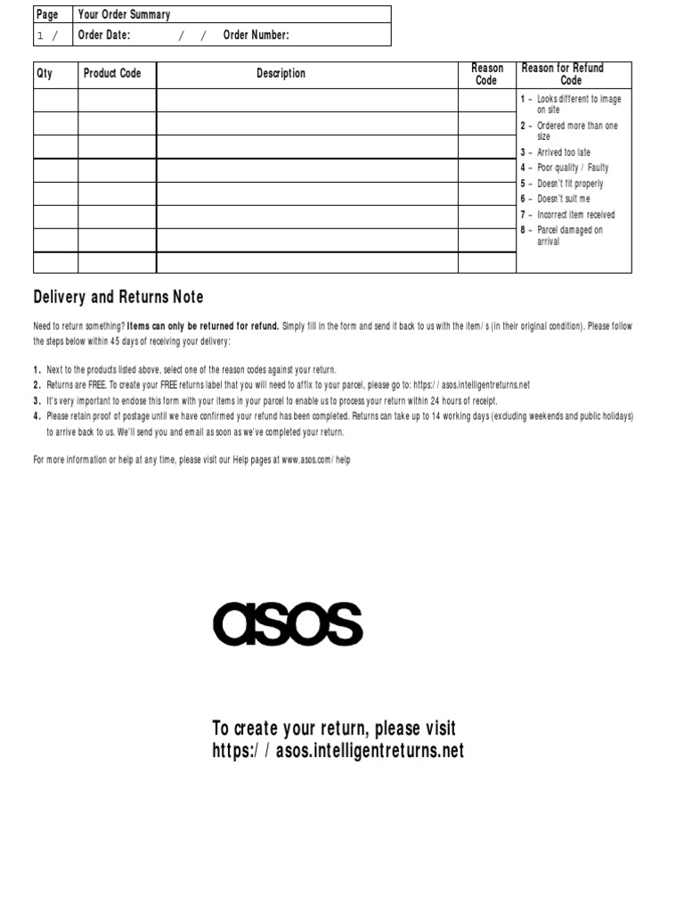 Easy-Breezy Ways To Request an ASOS Refund [Top Hacks] - DoNotPay Once you have your returns paper, here's what you need to do: List the products you bought Choose one of the reason codes offered and write it down Take the printed label from the returns note and attach it to your return package Make sure you attach the form to the parcel Send the package via your local UPS Keep the proof of postage ASOS Returns & Customer Service Guide - Groupon To make a return: Click on My Account and select My Orders Click Create a Return Select the items you'd like to return Select a reason for the return in the drop-down menu Select the drop-off location nearest you Click Create Return Look for your emailed return label Print the label and attach it to your package Drop off your package ASOS Returns Policy | ASOS Customer Care You'll no longer receive a paper returns slip with your order- instead, you can create your return through your ASOS account. At the moment you'll need to print a returns label if you want to return, but we're working on ways around this so watch this space! Click here for more information on how to return. ASOS Returns USA - ASOS Returns Policy - Parcel Monkey It's easy to print your ASOS return label via the ASOS website and you have a choice of two return options: 1. Return through USPS using one of the 35,000 post office locations nationwide. 2. Return through UPS Ground using one of the 47,000 locations nationwide. Does ASOS have free returns?