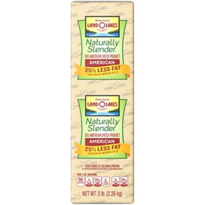 Naturally Slender ® 25% Less Fat American | Land O'Lakes 25% Less Fat than regular Pasteurized Process American Cheese, Contains 6g Fat, regular American Cheese contains 9g Fat, Good Source of Calcium, Good Source of Protein, See Nutrition Information for Saturated Fat and Sodium Content